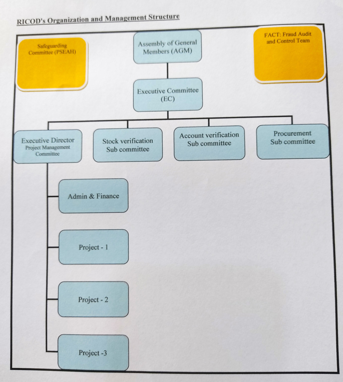 The programs/projects shall be managed from its office in Godawari municipality ward no. 11 Chapagaon, Lalitpur under the leadership of an Executive Director (ED), who is accountable to the RICOD Executive Committee (EC). The EC is accountable to the General Assembly (GA). EC also formed Fraud Audit and Control Team (FACT) & Safe Guarding Committee (SGC) that are functional.